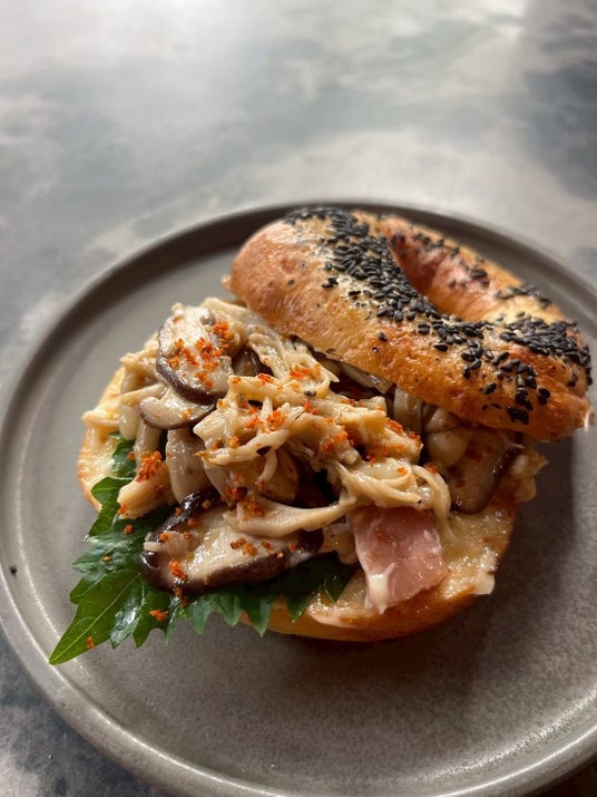 ・ゆずからりん入り自家製ベーグル/ピリ辛がクセになる。ゆずからりんを練り込んだベーグルサンド