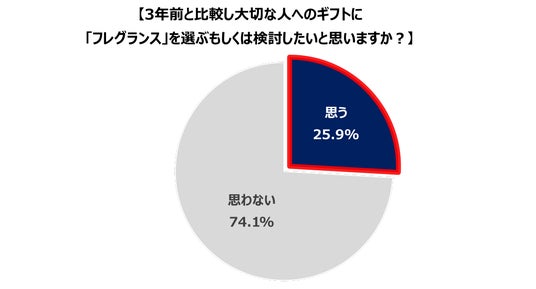 「3年前と比較し大切な人へのギフトに『フレグランス』を選ぶもしくは検討したいと思いますか」という質問をしたところ、4人に1人の25.9%が「はい」と回答しました。「身の周りでもフレグランスを使う人が多く抵抗感がない」が理由として最多だったほか、「大切な人をイメージしたものをギフトに贈りたい」も多数の回答を占めました。フレグランスを使用する人が増えたという実感が、大切な人への香りを贈る後押しになっていると推察できます。