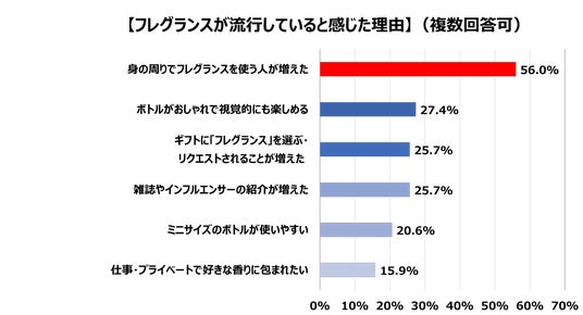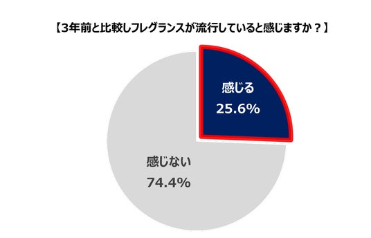 ◆4人に1人が、3年前と比べて「フレグランスが流行している」と実感。フレグランスが流行していると感じた理由で最多は「身の周りでフレグランスを使う人が増えた」こと。「3年前と比較してフレグランスが流行していると感じますか」という質問をしたところ、約4人に1人の25.6%の人が「感じる」と回答しました。感じたことがある人のうち、「身の周りでフレグランスを使う人が増えた」が最も多い理由となりました。「ギフトに『フレグランス』を選ぶ・リクエストされることが増えた」という回答も見られるなど、一般的に香りを身に纏うことのハードルが下がり、仕事・プライベート問わず様々なシーンにおいてフレグランスを使用しやすくなっていることが推察できます。また、回答数上位6項目には「ボトルがおしゃれで視覚的にも楽しめる」という、香りだけでなくパッケージのデザインを評価する声も見受けられました。