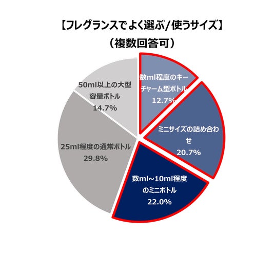 「フレグランスを手に入れる際、よく選ぶ/使うサイズを教えてください」という質問に対し、「数ml程度のキーチャーム型ボトル」、「数ml~10ml以下程度のミニボトル」、「ミニサイズの詰め合わせ」等、数ml~10ml以下程度のミニボトルを愛用する声が並びました。上記3回答それぞれを合計すると64.5%と、フレグランスにおける「ミニ化」需要が進行していることがわかります。前述の結果も踏まえると香りへのハードルが下がっていることに加え、ブランド側もミニサイズの展開が増え、生活者側も少量から様々な香りを試しやすくなっていることが相乗効果となっていると推察できます。