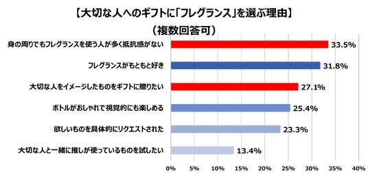 ◆大切な人へのギフトにフレグランスを選びやすくなった人の理由の上位に「身の周りでもフレグランスを使う人が多く抵抗感がない」「大切な人をイメージしたものをギフトに贈りたい」。フレグランスの流行感がギフト需要にも直結。