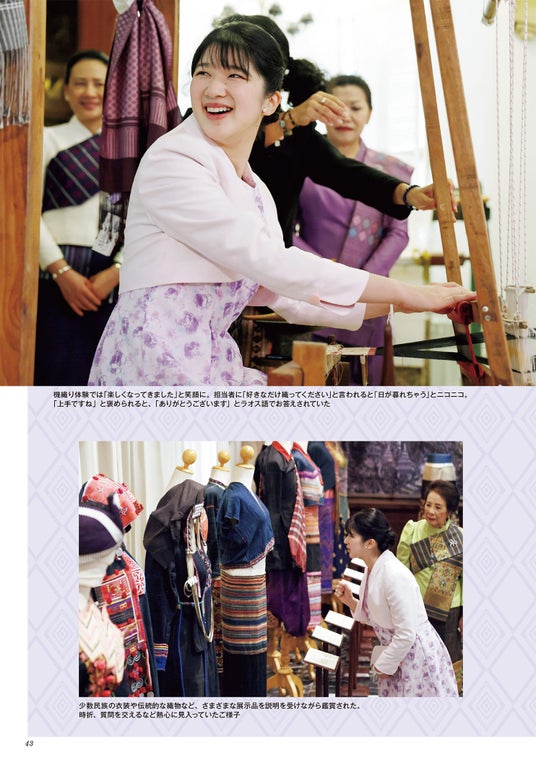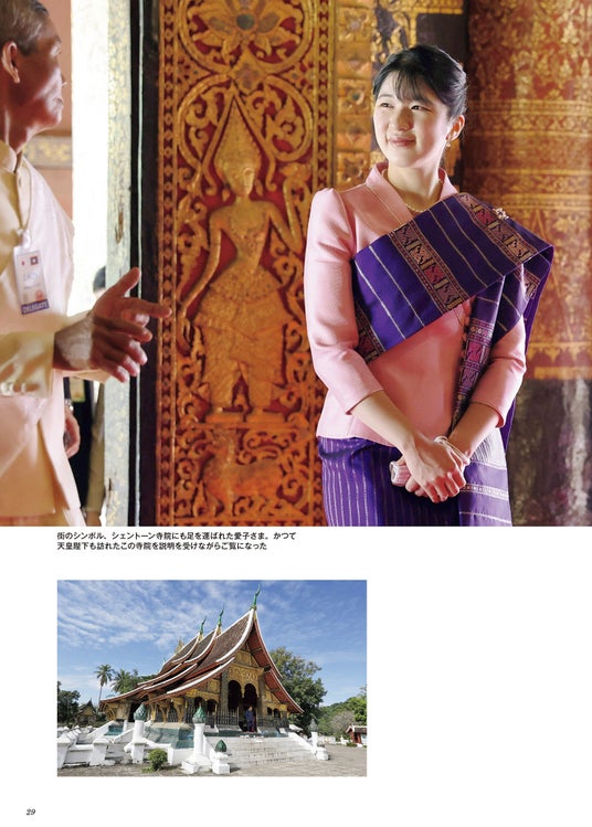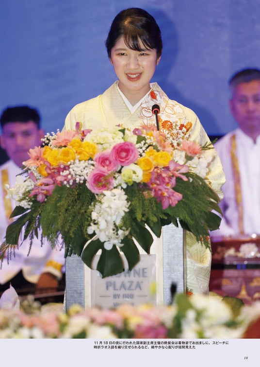 初めての海外公式訪問に臨まれた愛子さま。美しい花束で出迎えられたワッタイ国際空港や、塔からの景色を一望された凱旋門。トンルン国家主席を表敬訪問された際には夫人から送られた伝統衣装のシンを身にまとわれて、天皇陛下からのお言葉をお伝えに。健康や幸運を祈るラオスの儀式「パーシー・スークワン」、日本語を学ぶ生徒たちと言葉を交わされたビエンチャンの中高一貫校、いまも残る多くの不発弾の展示では真剣なまなざしを。