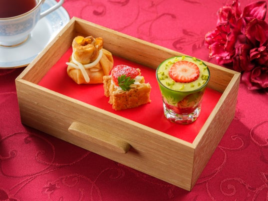 オリジナルの木箱の引き出しを開けると、華やかないちごスイーツが美しく並び、目にも楽しい優雅なティータイムを演出します。いちごのタルト、いちごのミルフィーユ、いちごのエクレア、いちごと神戸ワインのジュレなど、いちごの甘みと酸味を活かしたスイーツをラインナップ。さらに、いちごのクレープ巾着包みやいちごとチョコレートのドームといった、食感や味わいの変化も楽しめる品々を揃えました。セイボリーには蒸し鶏のベーグルサンドやクラムチャウダーなどを取り入れ、甘さの合間にほどよい満足感を添えています。
