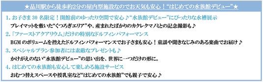 都心・品川駅から徒歩約2分というアクセスの良さも魅力の当館が、お子さまが安心して海の世界にふれあい、ご家族みんなで“はじめての水族館記念日”を過ごせるひとときをお届けします。