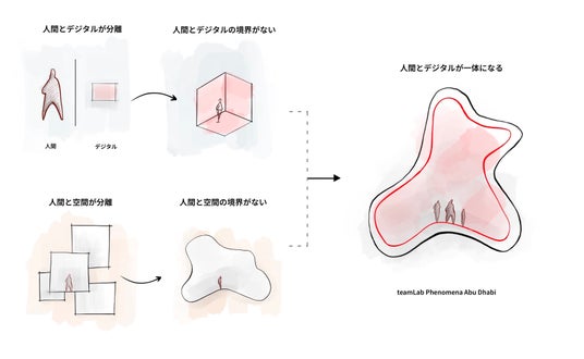 「今回のチームラボフェノメナは、いつも私たちが行う空間作りと逆の順番でつくっていったことが挑戦的でした。まず、自然にある有機的な形状と環境により形状がきまる「環境現象」というコンセプトが設定されました。私たちは人間の行動に基づいて内部空間の設計を開始し、その後、橋から見える海沿いの敷地を選定しました。そして、私たちが内部の作品空間の形状を確定した後、アブダビのMZアーキテクツがファサードを設計しました。通常は、ファサードを決め、内部の壁を決めていくのですが、今回は逆で、自由に内部空間を決めて、その後、外部ファサードを決定しています。そのため、建築の外観には、内部の形状がそのまま現れている部分があることがみてとれます。」