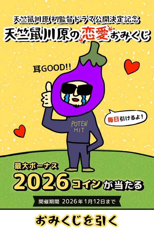 天竺鼠・川原克己の初監督ドラマ「君とその人の間」の公開決定を記念し、FANY :Dアプリ内で、年末年始限定の”恋愛おみくじ”キャンペーンを実施。アプリを開くと、川原書き下ろしイラストが付いたおみくじ結果が表示され、ユーザーは動画視聴に使用できるアプリ内コインを受け取ることができます。