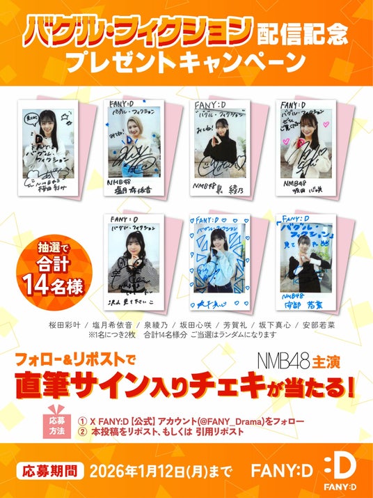 NMB48主演「バグル・フィクション」公開記念!X連動プレゼントキャンペーン12月18日(木)にFANY :Dで公開されたNMB48主演ドラマ「バグル・フィクション」に合わせて公式X連動のプレゼントキャンペーンを実施!