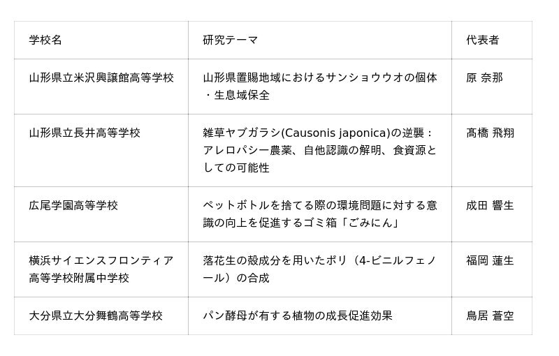 アサヒ飲料株式会社(本社 東京、社長 米女太一)は、中高生を対象とした研究助成プログラム「サイエンスキャッスル研究費 アサヒ飲料賞2025」に採択された研究の成果発表会を、12月20日にアサヒグループ本社ビルで開催しました。発表会には、高校と中学校合わせて5校の生徒が参加し、最優秀賞には大分県立大分舞鶴高等学校の研究テーマ「パン酵母が有する植物の成長促進効果」が選ばれました。