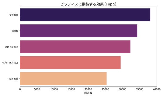 「ピラティスに期待する効果」では、悩みのトップだった「運動不足解消」を抑え、「姿勢(38,108人)」が1位となりました。 単に体を動かすだけでなく、「ピラティス前後での姿勢の変化」や、美しいボディラインへの変化を強く求めていることが伺えます。次いで「引締め(34,285人)」が続き、ダイエットやボディメイク効果への期待も非常に高い結果となりました。
