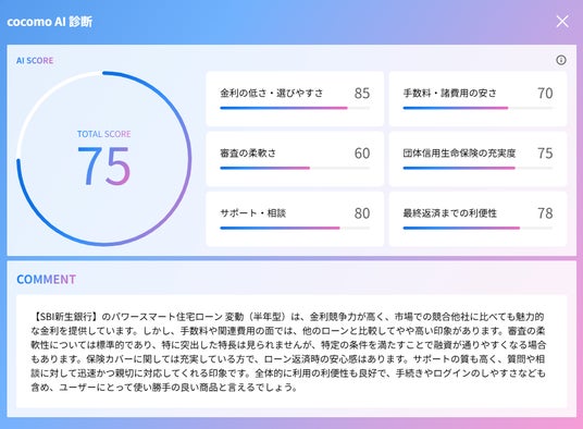 独自開発の「cocomo AI」が、各住宅ローンを6つの観点で数値化。客観的な指標をもとに、ユーザーが直感的に比較できるようになりました。