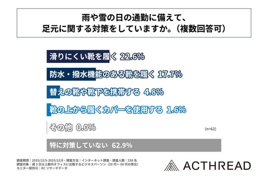 調査の最後、雨や雪の日の通勤において、足元の悪さにストレスを感じないビジネスパーソンを対象に「雨や雪の日の通勤に備えて、足元に関する対策をしているか」を尋ねる設問への回答では、1位が「特に対策していない」で62.9%、2位が「滑りにくい靴を履く」で22.6%、3位が「防水・撥水機能のある靴を履く」で17.7%という結果になりました。この結果から、雨や雪の日の通勤において、足元の悪さにストレスを感じていない人の約6割が、足元に関する「対策をしていない」一方で、「滑りにくい靴を履くこと」や「防水・撥水機能のある靴を履くこと」といった対策をしている人も一定数いることがわかりました。