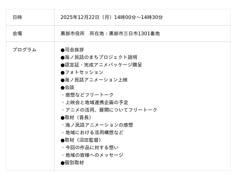 一般社団法人日本昔ばなし協会と日本財団が取り組む「海ノ民話のまちプロジェクト」は、富山県黒部市を舞台にした海ノ民話アニメーション「新治神社の霊火」が完成したため、12月22日(月)にアニメ監督が黒部市を訪問し、アニメのお披露目と「海ノ民話のまち」認定式を実施しました。このイベントは、次世代へ豊かで美しい海を引き継ぐために、海を介して人と人とがつながる“日本財団「海と日本プロジェクト」”の一環で実施しています。