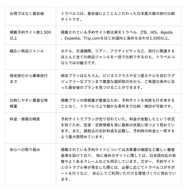 トラベルコは、これまでもこれからも「最も安く・最も便利で・最も親切に」をモットーに、皆さまの快適な旅を全力でサポートしてまいります。