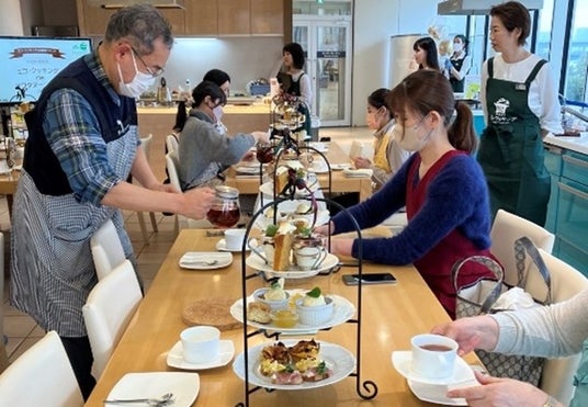 完成したアフタヌーンティーを試食する様子