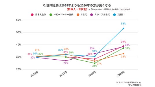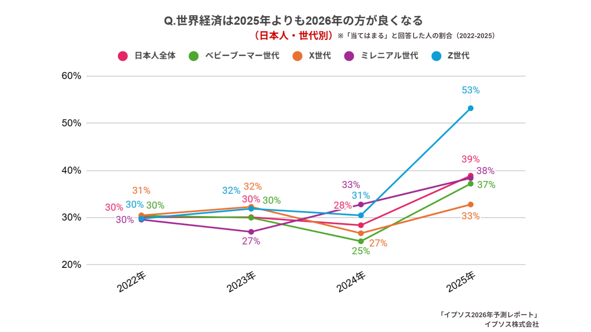 「世界経済は2025年よりも2026年の方がよくなる」という質問に「当てはまる」と答えた日本人は、前年の28%から11ポイント上昇し、39%となりました。特に、Z世代においては前年の31%から大幅増の53%となり、半数以上がポジティブに感じていることがわかりました。前世代の中でも突出した期待感と言えます。