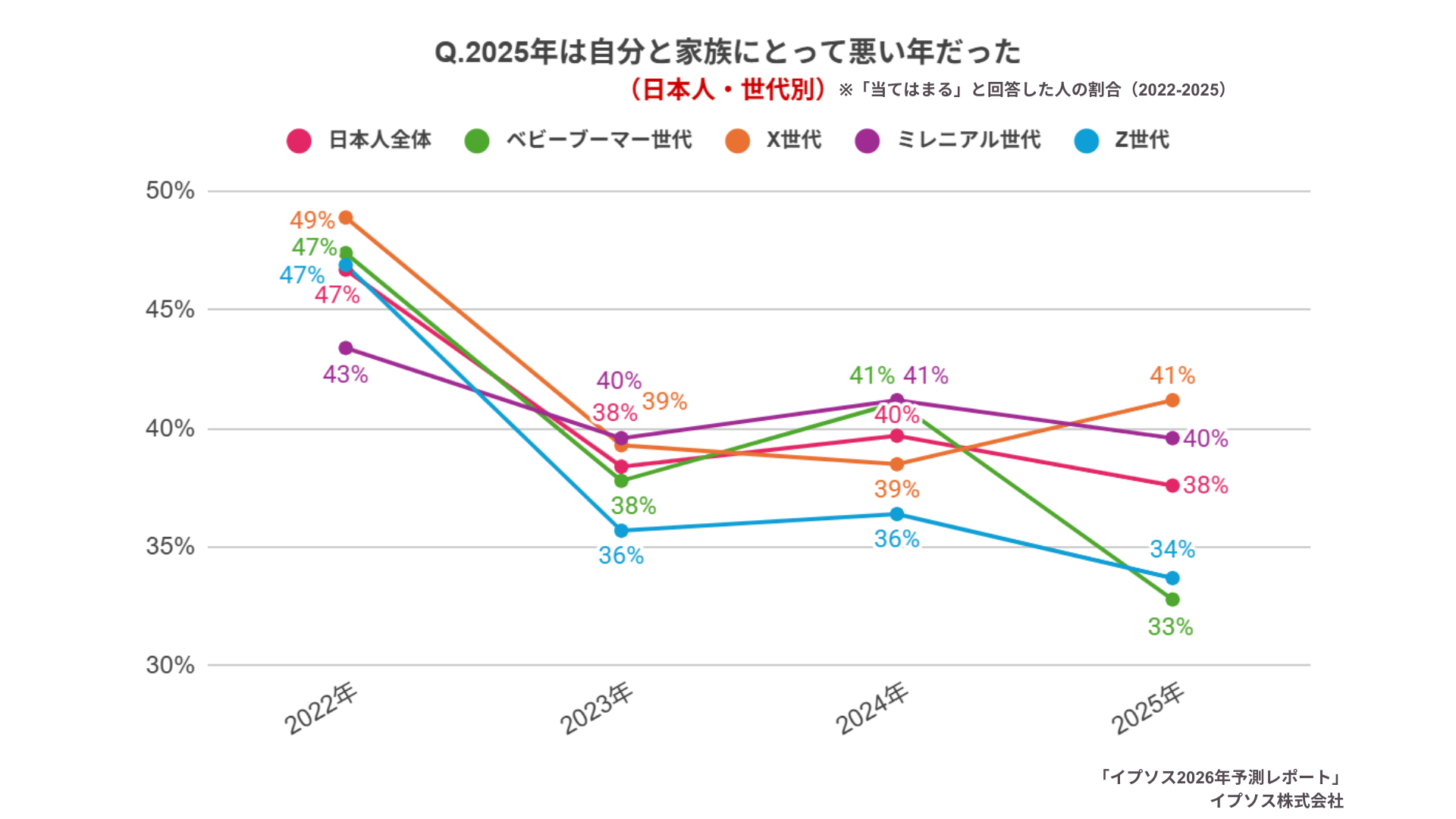 個人や家族の状況について、「今年は自分と家族にとって悪い年だった」と回答した人は日本人全体では38%となり、3年前の47%からは9ポイント減、前年からも2ポイントマイナスと、減少傾向が続いています。世代別では、ベビーブーマー世代が前年より8ポイント減少となった一方で、X世代では2ポイント増加しています。