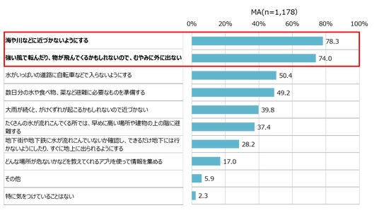 あなた自身、もしくはお家の人と一緒に、台風や大雨の日にどんなことに気を付けていますか。