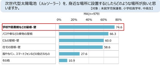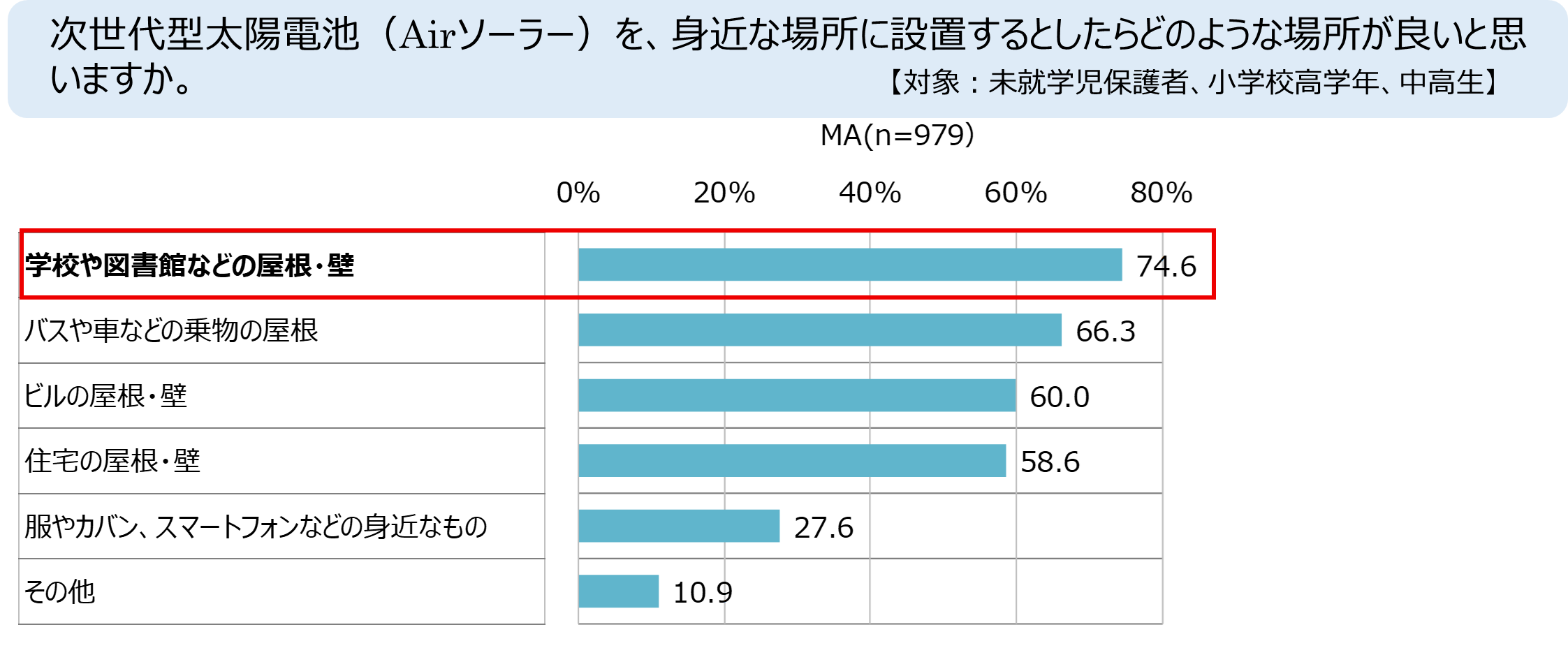 次世代型太陽電池(Airソーラー)を、身近な場所に設置するとしたらどのような場所が良いと思いますか。 【対象:未就学児保護者、小学校高学年、中高生】