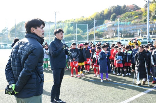 GKクリニック終了後は、コノミヤ・スペランツァ球技場に試合に来ていた小学生が全員集合。サイン入りグッズなどをプレゼントするじゃんけん大会で盛り上がりました。閉会にあたって、権田選手は、「これだけは負けないっていう自分だけの武器をつくってください」と負けない強みをつくることが日本代表にもつながると話しました。また、「ヨドコウ桜スタジアムやノエビアスタジアム神戸にJリーグの試合を見に来て、選手たちの真似をして、考えて練習をしてくれたらと思います」とアドバイスを送りました。にぎやかに行われた1日は、全員集合の記念写真を撮って、幕を下ろしました。