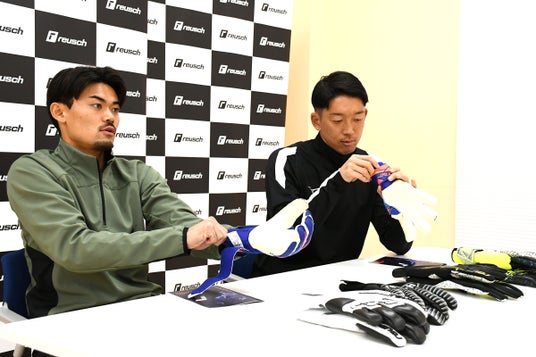 対談は、それぞれが着用するキーパーグローブについてのコメントからスタート。権田選手は、「この矢印デザインのモデル『ファストグリップ』シリーズを使っています。さらっとしていて耐久性があるから、ヴィッセルに入って3ヶ月ほどで4つを使いまわしていても十分ですね。来シーズンもこれです」と話しました。