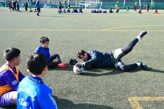 福井選手は、「キーパーってポジションを楽しんでもらえたらと思います」と前置きをした後に、セービングのポイントを順番に説明。「意識してほしいのは、地面と手で壁をつくること。次に上からふたをしてボールをしっかりとキャッチすること。ボールが緩いとその分足を運んでキャッチしてください」と実際に大きく体を動かして実践。子どもたちの喜ぶ表情を見て、「サッカー選手って、子どもたちに夢を与えられる仕事だっていうことも感じますね」と振り返りました。