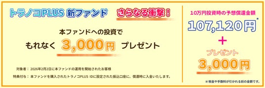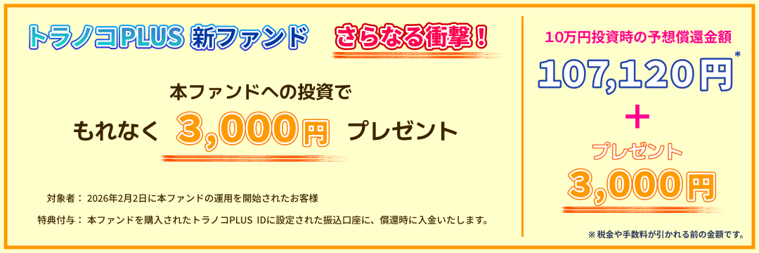 今回は、年率7.12%を目指す新ファンドリリースに加えて、3,000円プレゼントキャンペーンの実施、また、トラノコPLUS(月額利用料無料サービス)を全てのお客様にご利用いただけるよう、新たにトラノコPLUSのみをご利用いただける口座開設機能も提供開始しております。