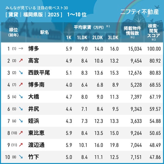 今回の調査では「博多」が3年連続で首位をキープ。福岡市の中心部である「高宮」「西鉄平尾」「大橋」など、西鉄天神大牟田線沿線のエリアが上位を占める結果となりました。
