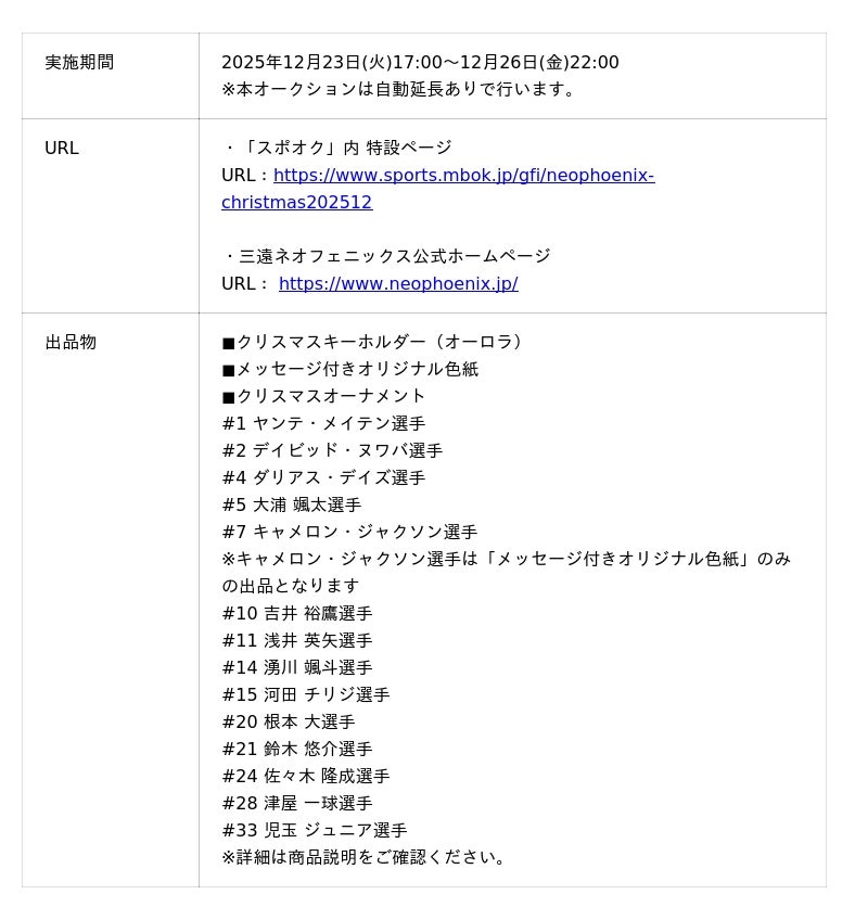 【 三遠ネオフェニックス 2025-26シーズン クリスマスオークション概要】