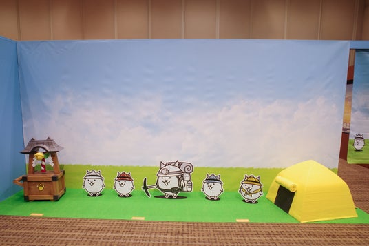 会場内でまず注目したいのが、ゲーム内ステージを再現した展示エリアです。入口には約3メートルのビッグサイズのにゃんこ城が登場し、来場者はここから“にゃんこ軍団の一員”として出撃します。