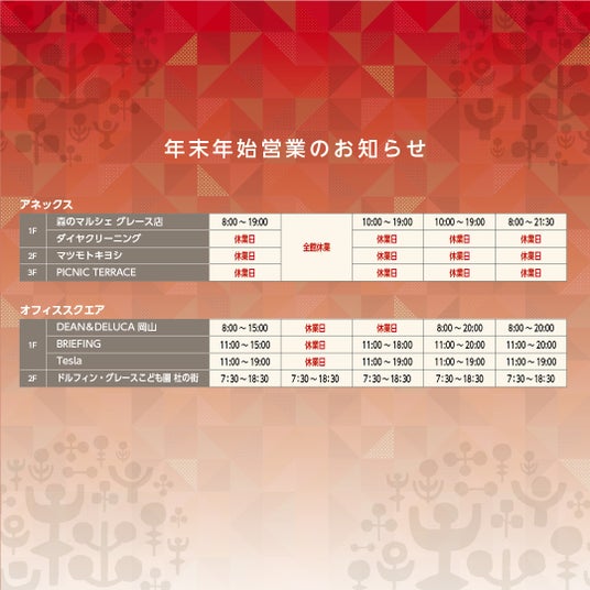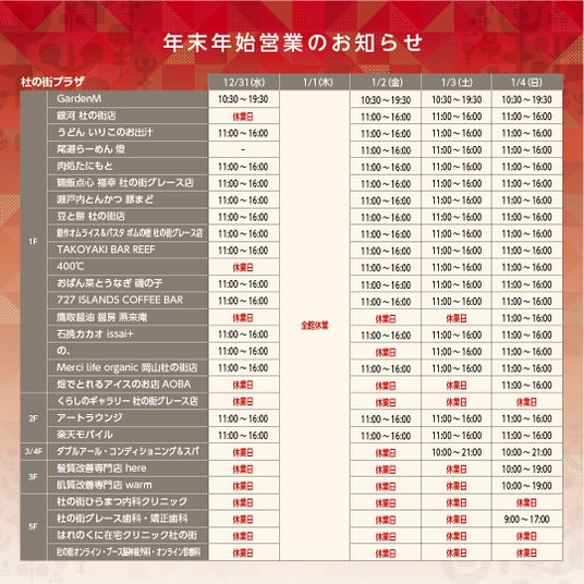 店舗によって営業日が異なります。詳しくは以下の「年末年始営業のお知らせ」また、杜の街グレース公式HP(https://www.morinomachi-grace.jp/) をご確認ください。