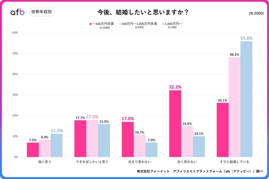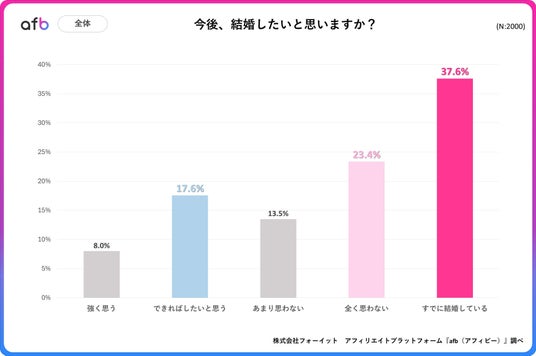 アフィリエイトプラットフォーム「afb(アフィビー)」< https://www.afi-b.com/ >の開発運用をおこなう株式会社フォーイットは、全国の20代~60代までの男女2,000人を対象に結婚観に関するアンケートを実施し、年代別等の特徴についてまとめました。