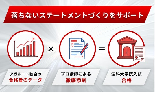法科大学院入試において、必ず提出しなければならないものの、受験生の手が回っていないステートメント。アガルートでは過去の合格者のデータを用いて、ステートメントの方向性や注意点をお伝えし、落ちないステートメントづくりをサポートします。また、添削もついていますので、正しい方向性に導きます。
