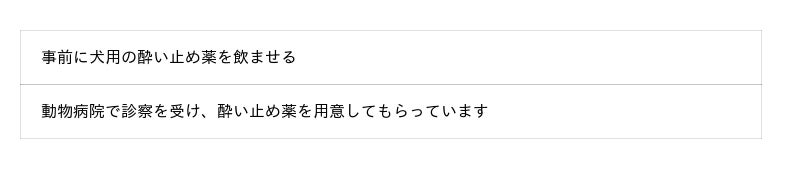 - 車酔い対策としては、酔い止め薬の使用、食事時間の調整、こまめな休憩、換気、声かけや持ち物による安心感の確保など、複数の工夫を組み合わせて行っている飼い主が多い