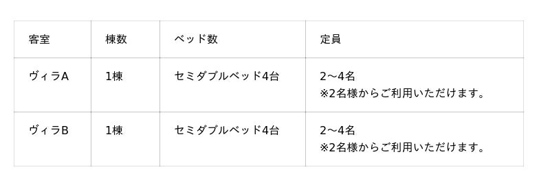 各客室には、専用ドッグラン・広々としたリビングダイニング・いつでもご利用いただけるお風呂を完備。最大4名様までご宿泊いただけるゆとりある空間は、グループやご家族での滞在にも最適です。