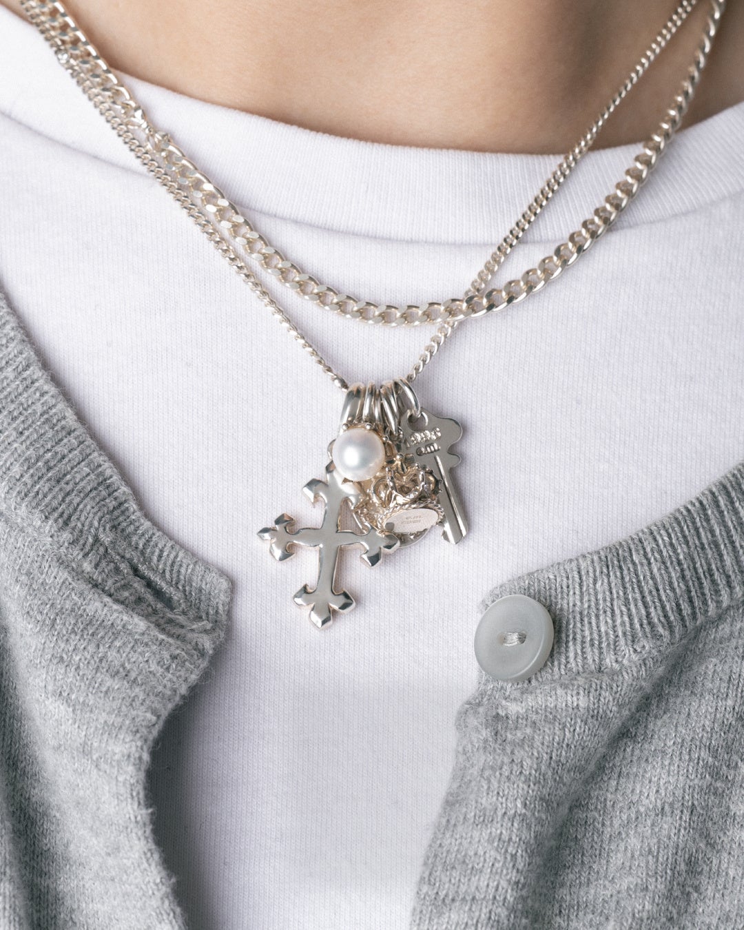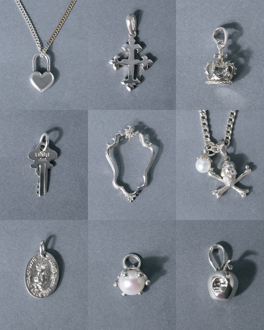 上段左から Heart lock¥20,900、Cross¥23,100、Crown¥19,800、KEY¥16,500、Dream frame¥14,300、Skull¥25,300 、Milk crown pearl Φ7mm¥16,500、e.m. Medal¥17,600、Milk crown pearl Φ10mm¥19,800、Worm-eaten apple¥30,800 すべて税込