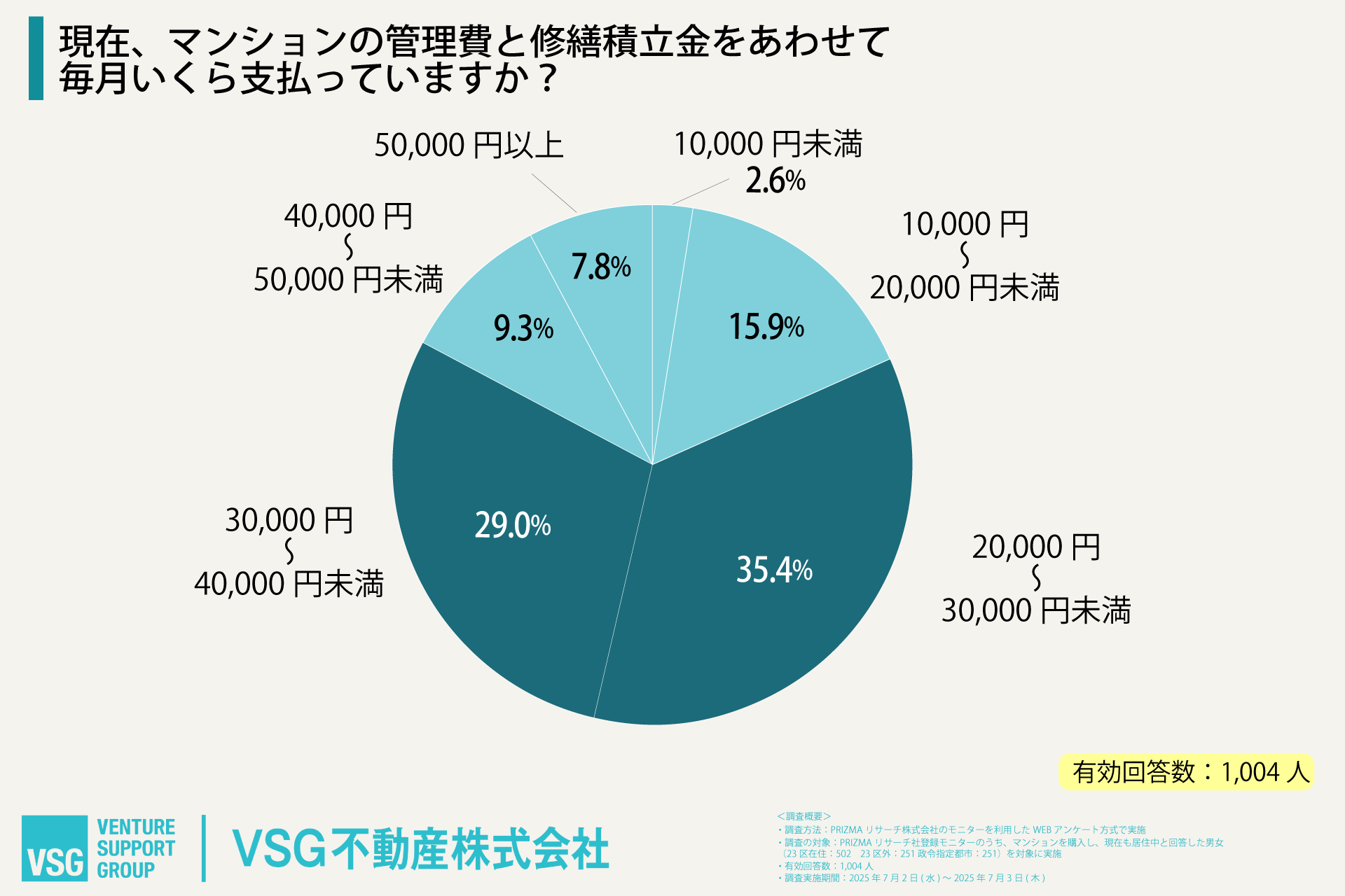 管理費と修繕積立金の合計負担額は、「20,000円~30,000円未満」が35.4%、「30,000円~40,000円未満」が29.0%であり、2~4万円のレンジが全体の6割超を占める結果となった。さらに、「10,000円~20,000円未満」も15.9%に上り、1~4万円帯で約8割が該当する構図である。