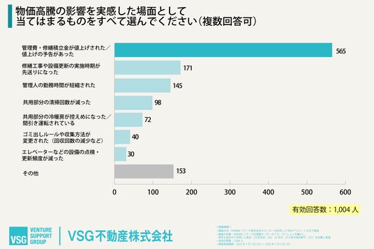 物価高騰を実感した場面として最も多かったのは「管理費・修繕積立金が値上げされた/値上げの予告があった」が56.3%で、過半数を占めた。次いで、「修繕工事や設備更新の実施時期が先送りになった」が17.0%、「管理人の勤務時間が短縮された」が14.4%となっている。