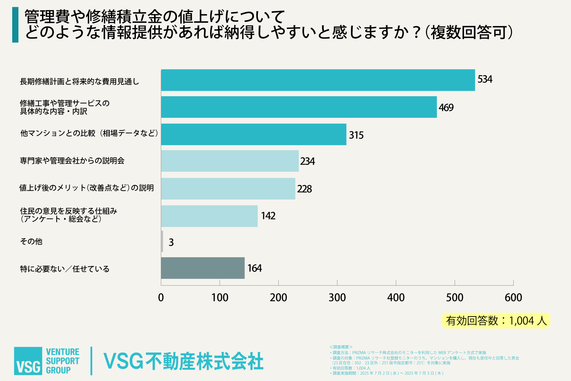 「特に必要ない/任せている」は16.3%と少数派であり、大半の居住者は「数字と計画に基づく説明」を求めている。値上げを単なる通知で済ませるのではなく、長期修繕計画と紐づけたストーリーとして示せるかどうかが、納得感を左右する決定要因になっていると考えられる。