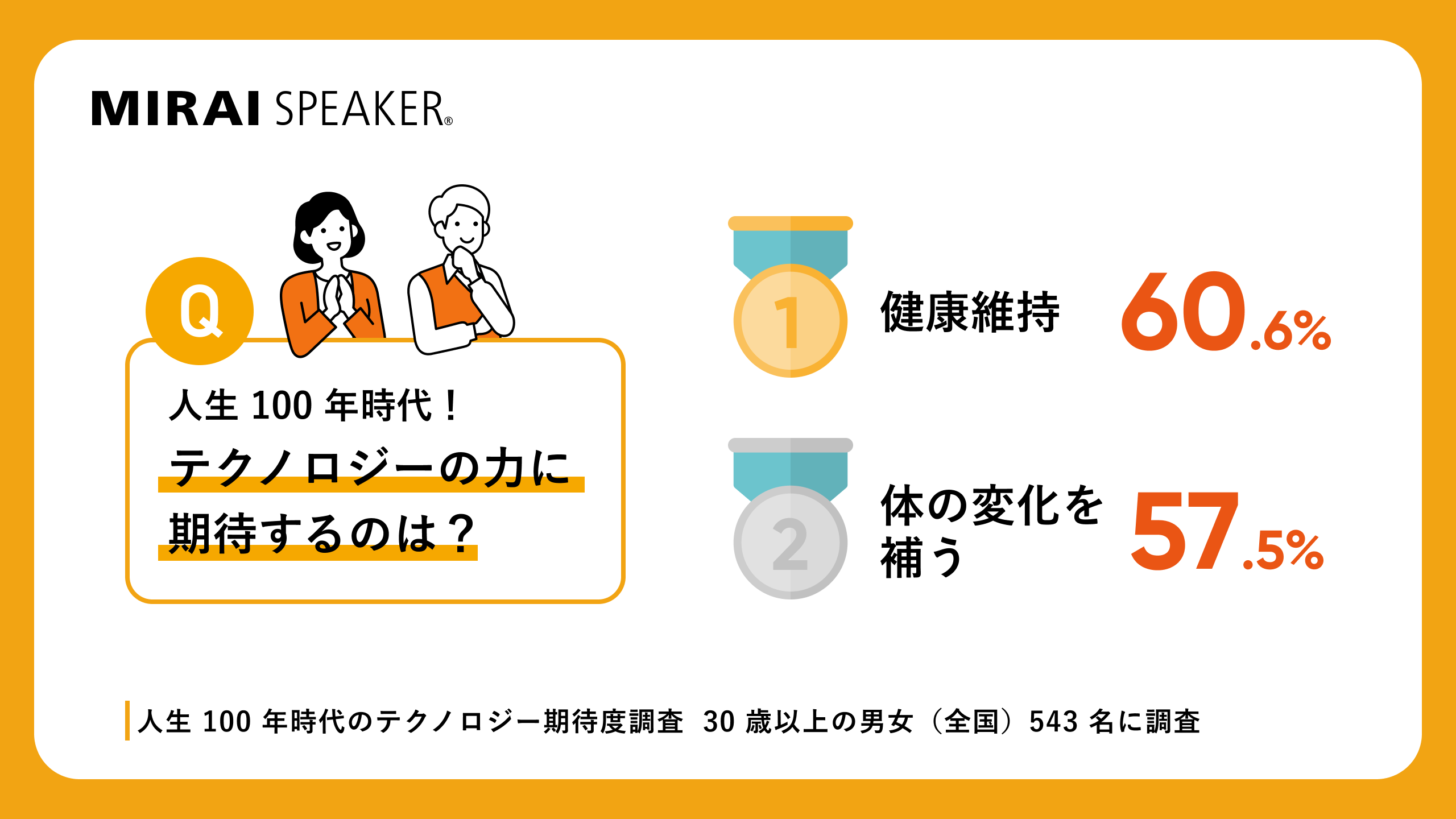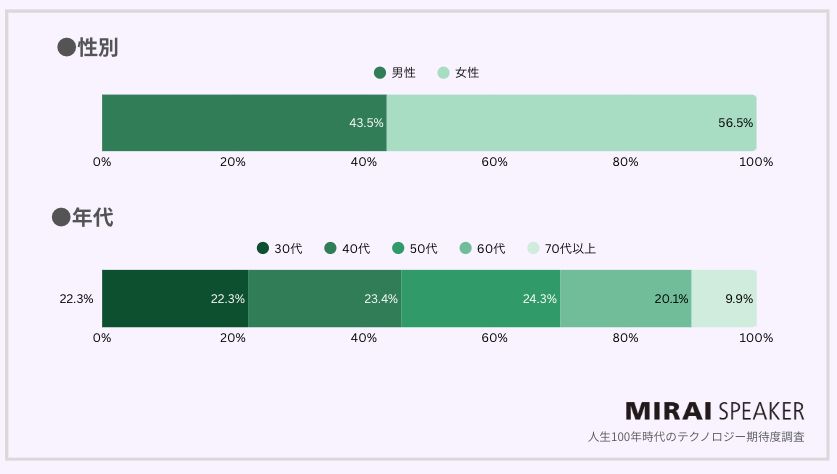 「100年の人生をテクノロジーで豊かにする」という想いのもと、テクノロジーの力で、誰もが明るく前向きに暮らせる社会づくりをめざす株式会社ミライスピーカー(所在地:東京都中央区、代表取締役社長:山地浩、以下「当社」)は、人生100年時代のテクノロジー期待度調査を、全国の30歳以上の男女543名に対して実施し、その結果を発表いたします。