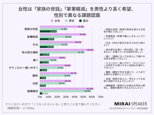 性別で異なる課題意識、女性は「家族の世話」「家事軽減」で、男性を10ポイント以上上回り半数以上に