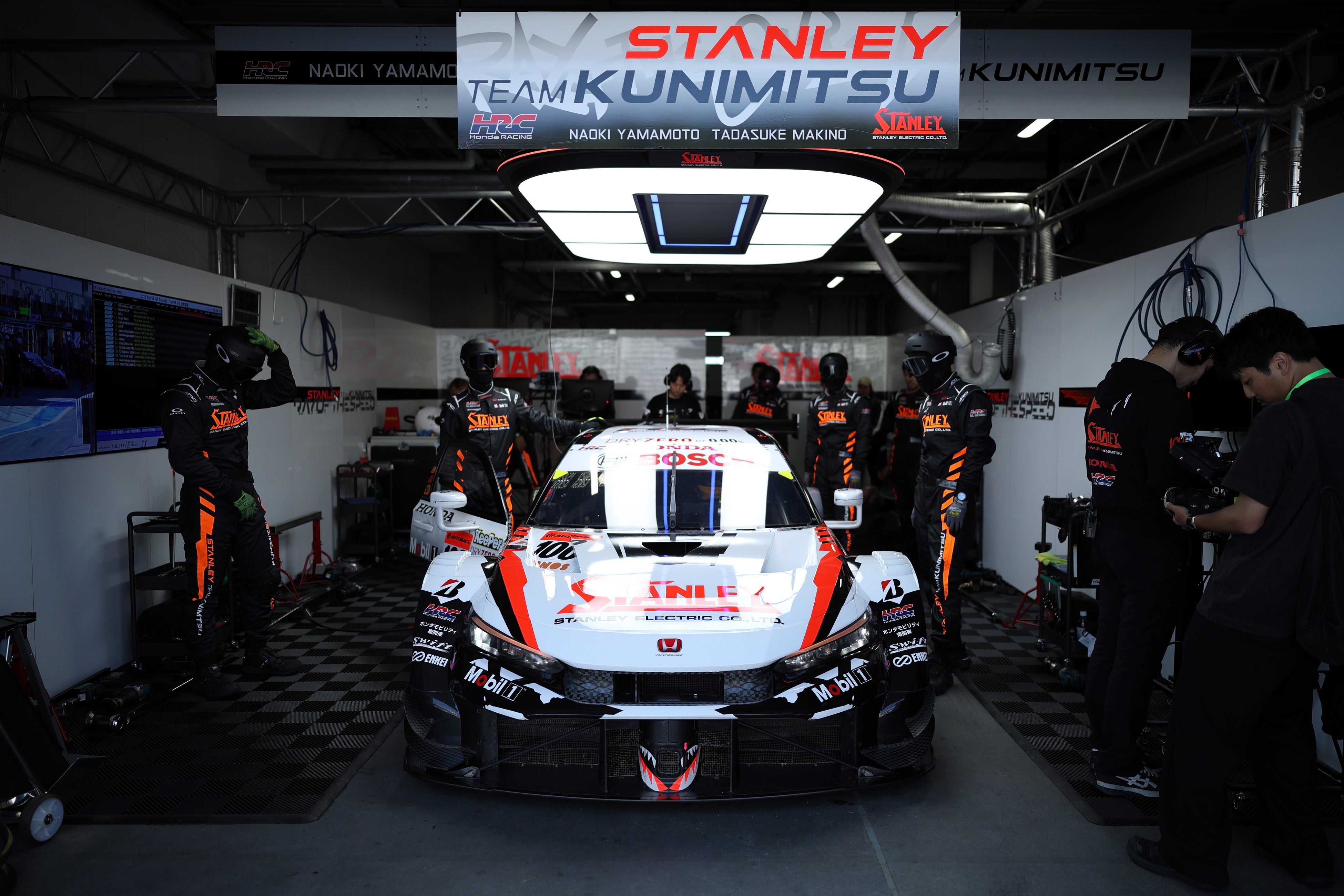 ピット用に最適化した当社製のオーバーヘッド照明がマシンを照らします。STANLEY TEAM KUNIMITSUのピットにおける照明環境は、先進的なデザインの採用と軽量化による設置負担の軽減を実現しています。従来品の5倍の明るさや無影灯化による作業効率向上で、光の技術を強みとする企業としてチームをサポートしています。