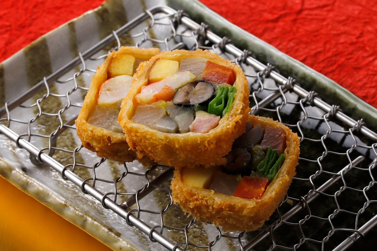 おせち料理に想いを重ねた縁起の良い食材を、京都ならではの湯葉で包み込んだ「宝巻きかつ」。