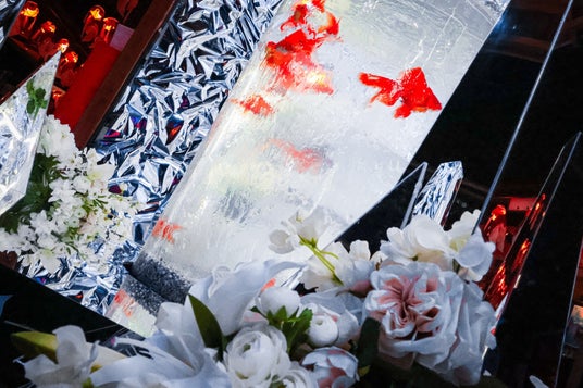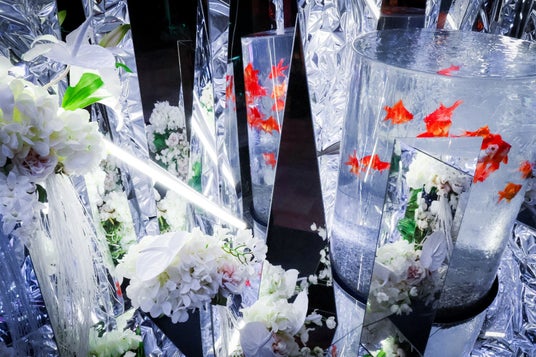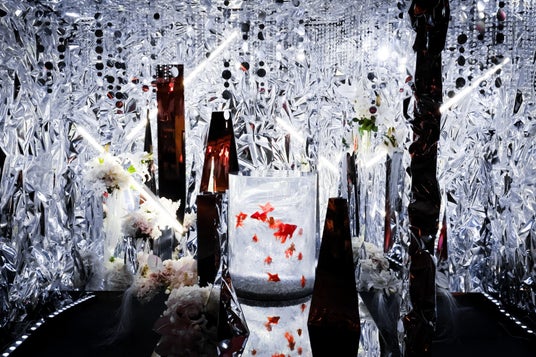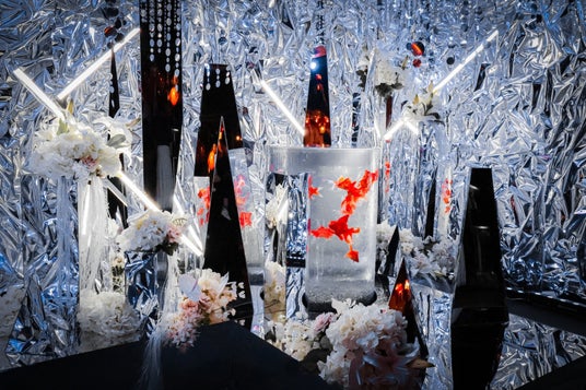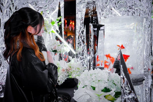 会場中央には、鏡面素材に包まれた円柱型の特設水槽を配置。クリスタルや鏡パネル、光の粒子のように降り注ぐライティングが織りなす環境は、まるで“氷の結晶で形成された水中都市”を思わせる壮大な銀世界を演出します。