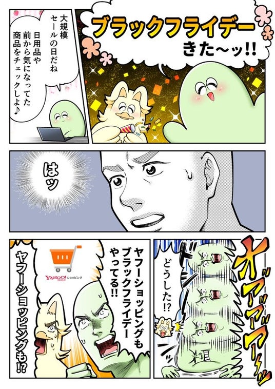 「ヤフショのブラックフライデーは、おトク満載のビッグチャンス」であることを漫画とアニメーションで表現