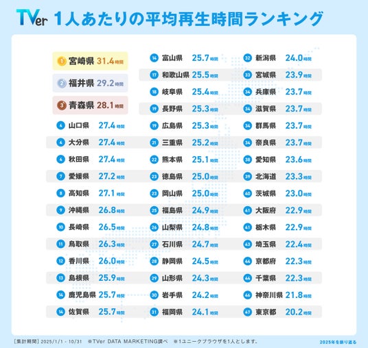 2025年1月1日から10月31日の集計における、1人(※4)あたりの平均再生時間(※5)は、2024年と同様に1位が宮崎県、2位が福井県となりました。上位を、複数の系列のネットワークに加盟しているクロスネット局のある県が占めたことから、居住地域の地上波放送では見られない番組もTVerを通じてお楽しみいただいている様子がうかがえます。
