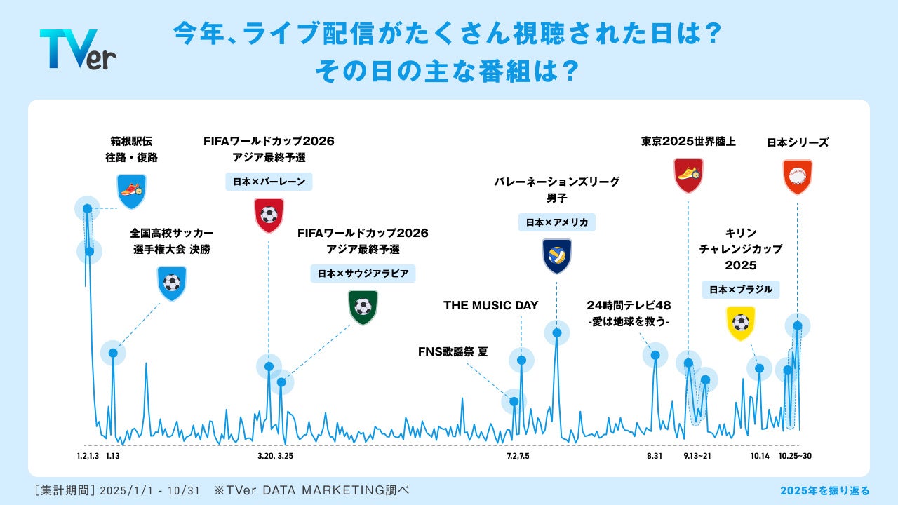 ※1:2025年202510月1日~10月31日における、TVer単体のVOD・リアルタイム配信・追っかけ再生およびSP LIVEを合計した全デバイスでの動画再生数(TVer DATA MARKETING調べ)