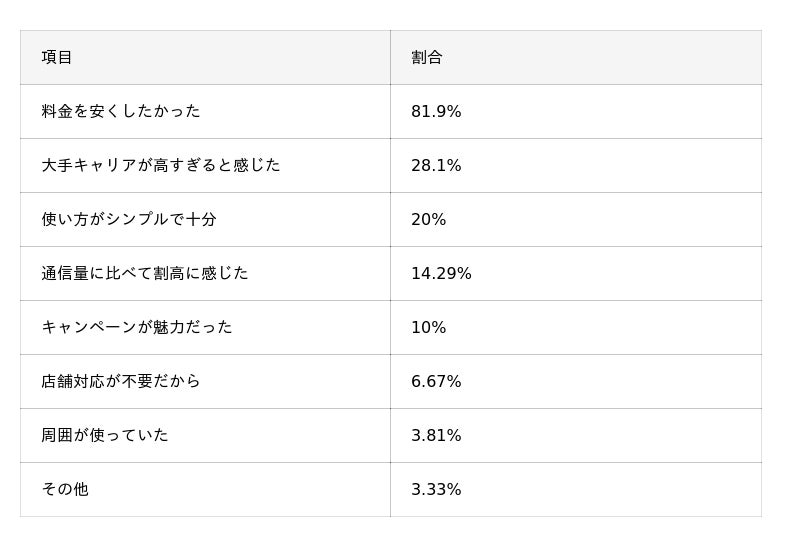 - 料金の安さを重視して格安SIMへ乗り換えた人が圧倒的多数