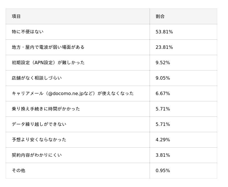 困った点としては「地方・屋内で電波が弱い」「初期設定が難しかった」といった声が挙がった一方、「特に不便はない」と回答した人が過半数を占めました。月額料金・通信速度ともに「満足」「とても満足」が多数を占めており、価格と品質のバランスに納得している利用者が多いことがうかがえます。