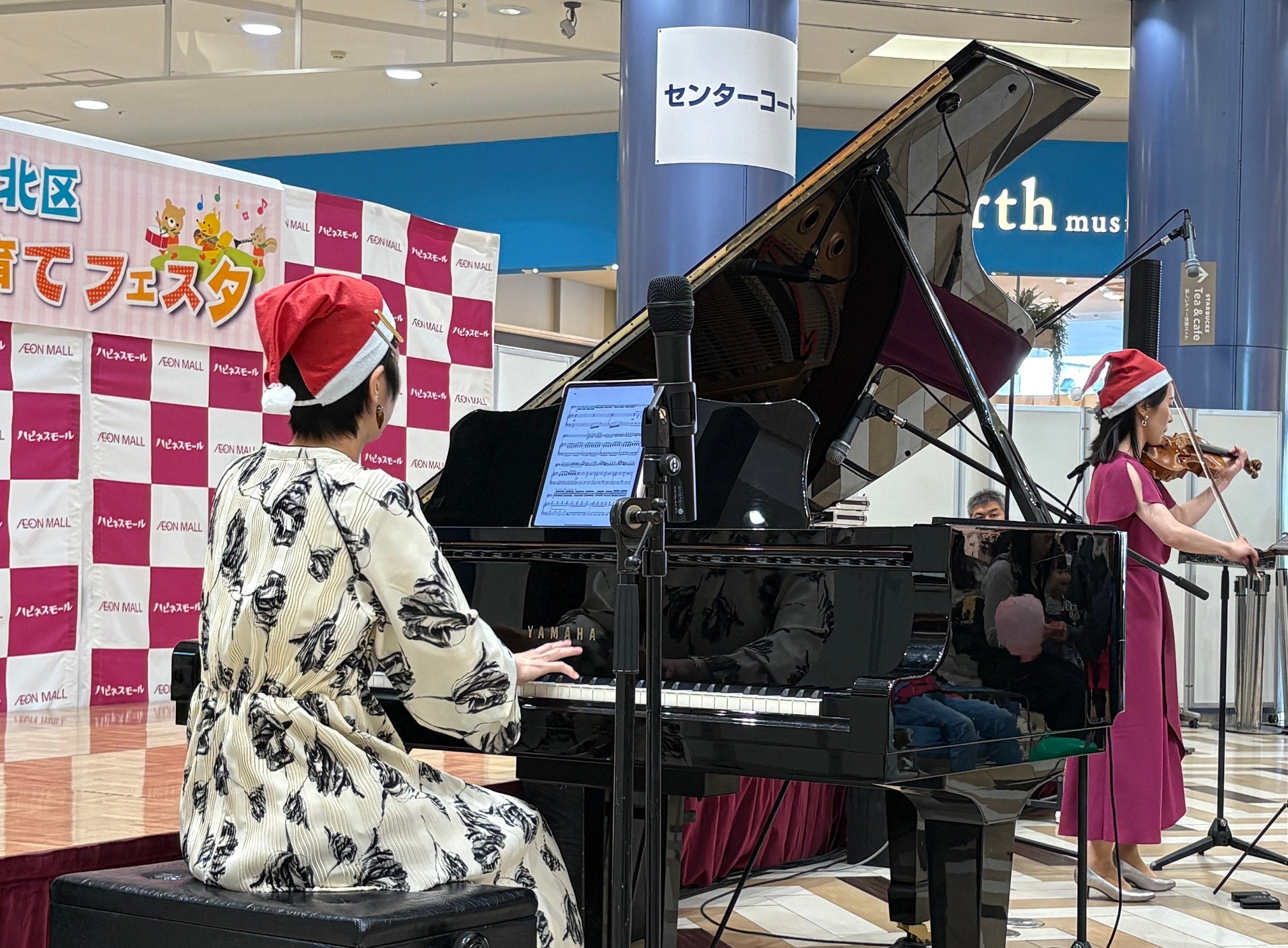 写真左から、山之内 里衣さん(ピアノ)、まごころパンダくん、望月 茉莉奈さん(ヴァイオリン)