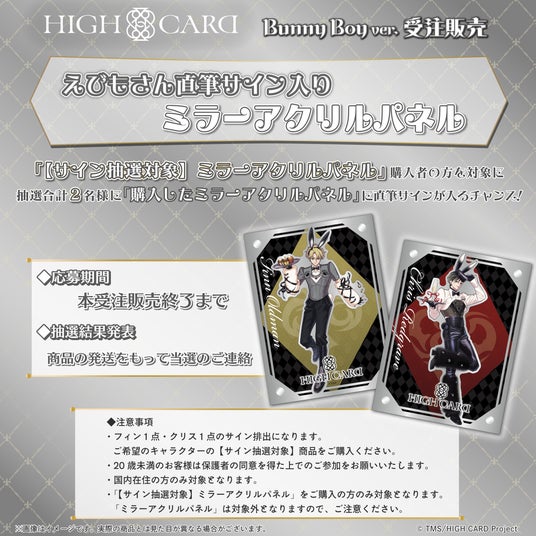 株式会社サトクリフ(本社:東京都千代田区 代表取締役社長:加藤 勝)は、運営するオンライン販売サイト「クリフストア」にて、TVアニメ『HIGH CARD』キャラクター原案えびも氏による描き下ろしイラスト「バニーボーイ ver.」グッズを2025年11月28日(金)より受注販売開始しました。